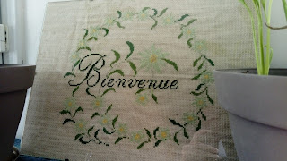 Beaucoup de plaisir à broder cette grille, d'abord le bienvenue puis la couronne, fleurs après fleurs, croix après croix...
